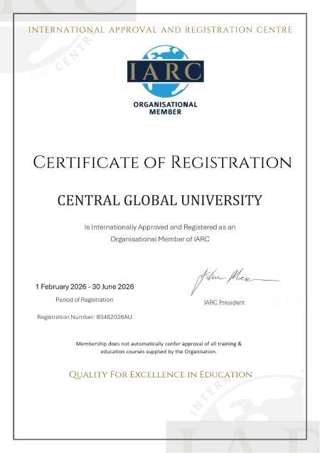 CGU’s accreditation is formally validated through the IARC Certificate of Registration for the 2025–2026 membership period (Registration No. 83462026AU), confirming the university’s status as an Internationally Approved and Registered Organisational Member.